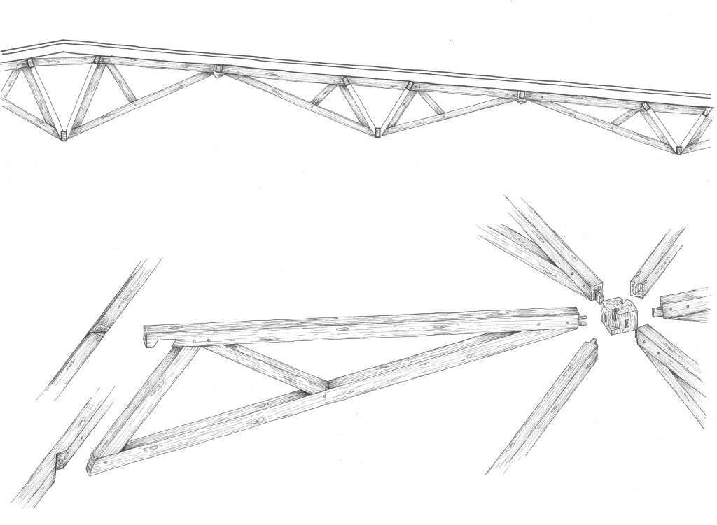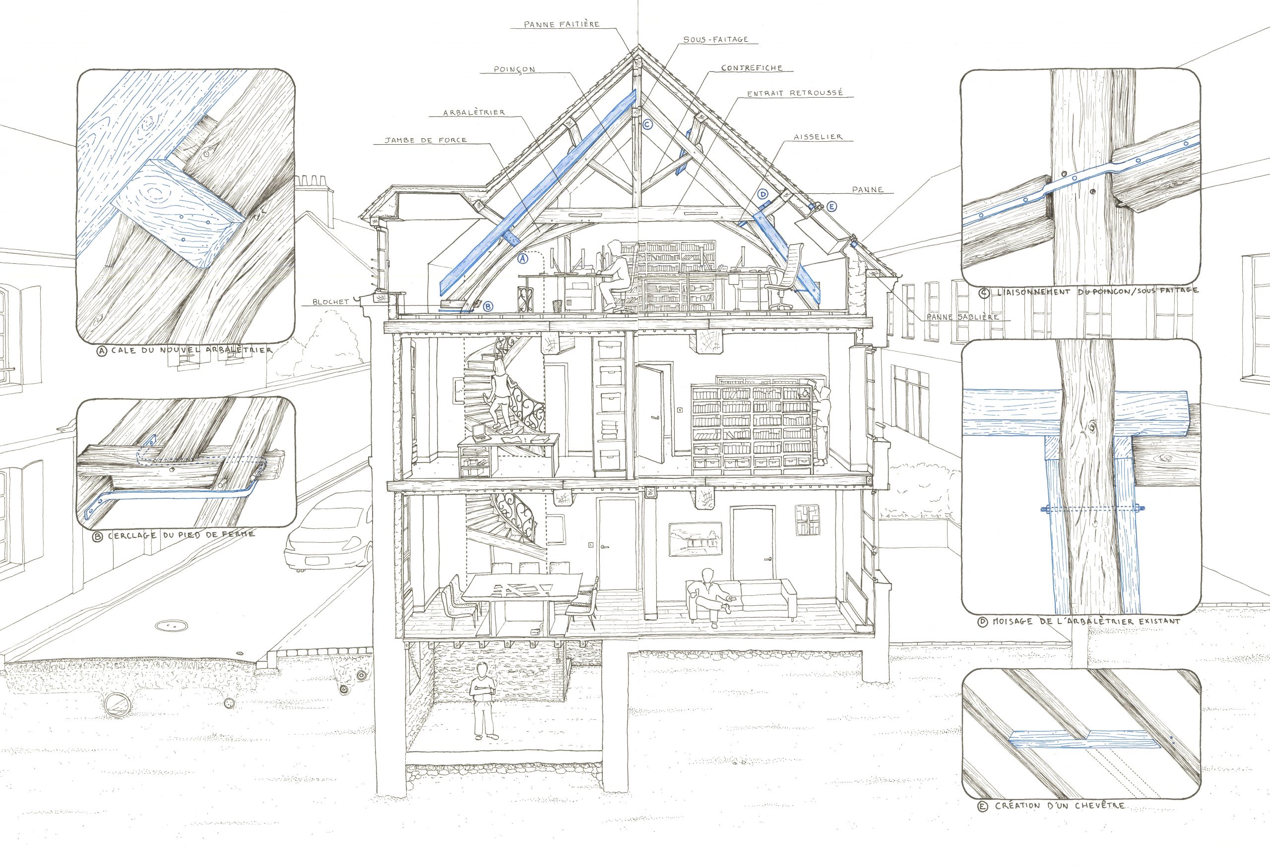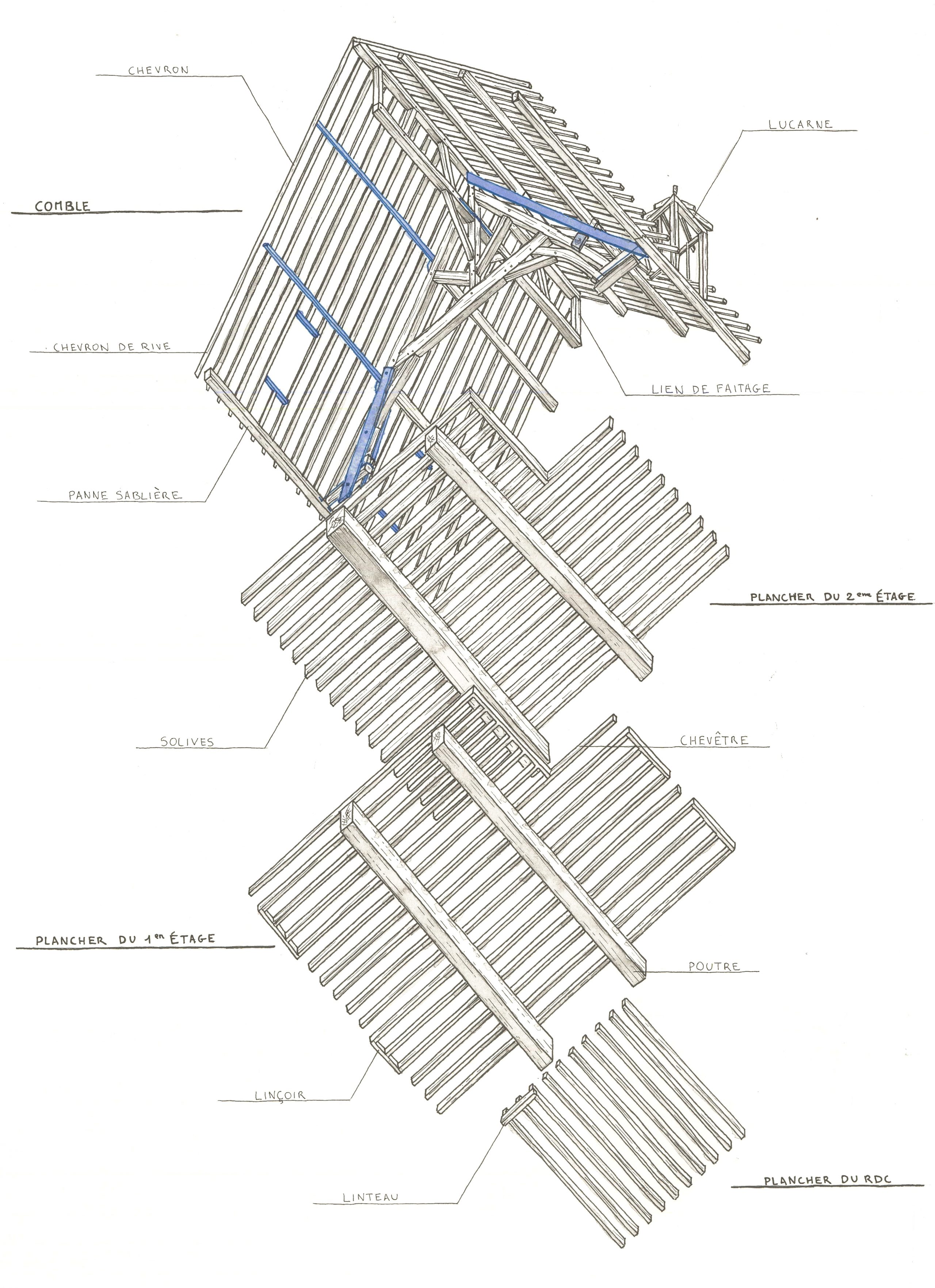 Etude de différentes références architecturales et analyse de l’habitat personnel sur le thème de la charpente. Ce travail a mis en évidence le « rafistolage » des charpentes anciennes et la capacité offerte par l’association d’autres matériaux à prolonger sa durée de vie ou à en augmenter sa performance.